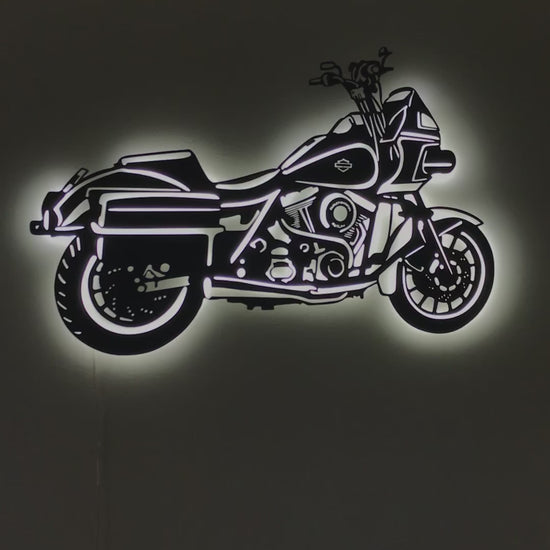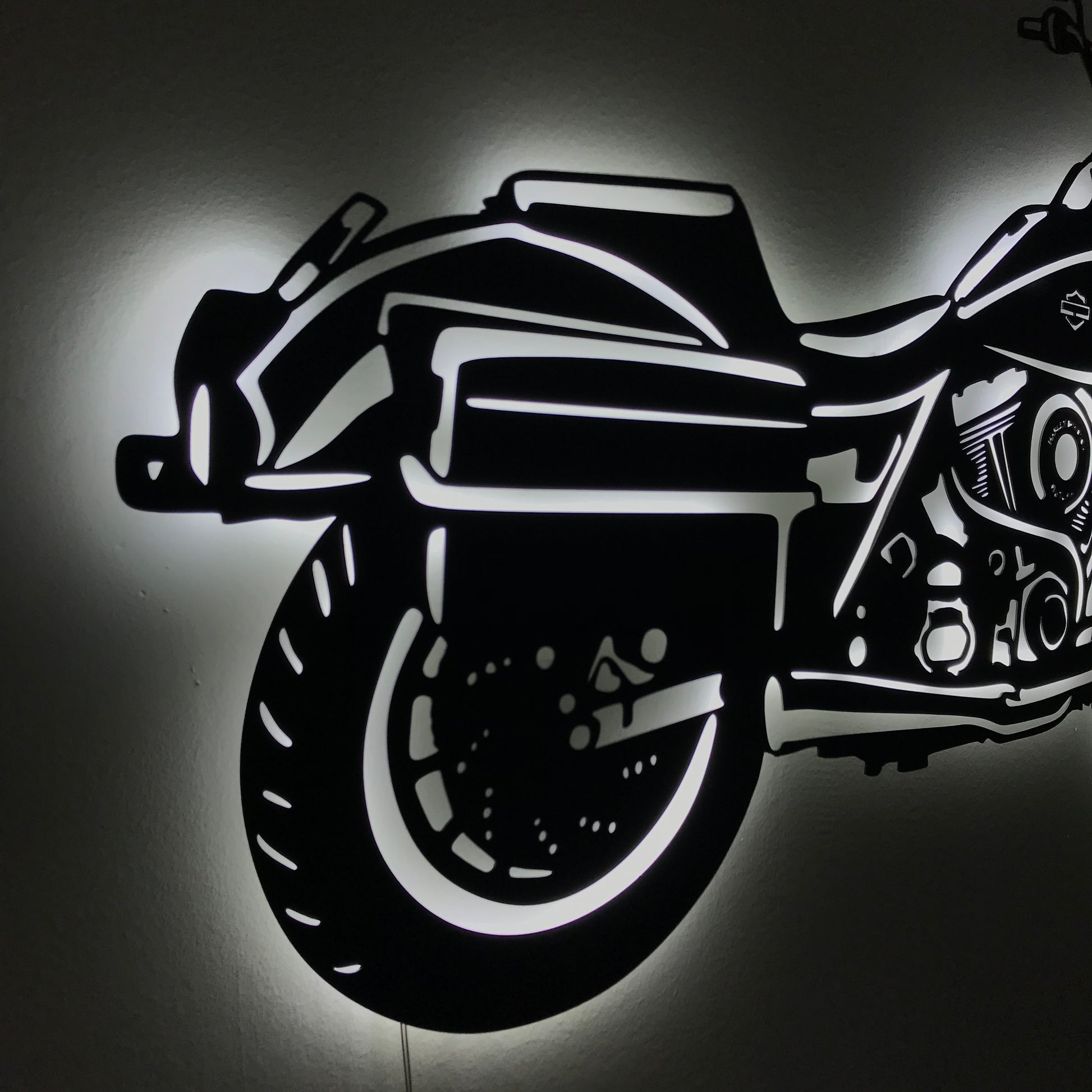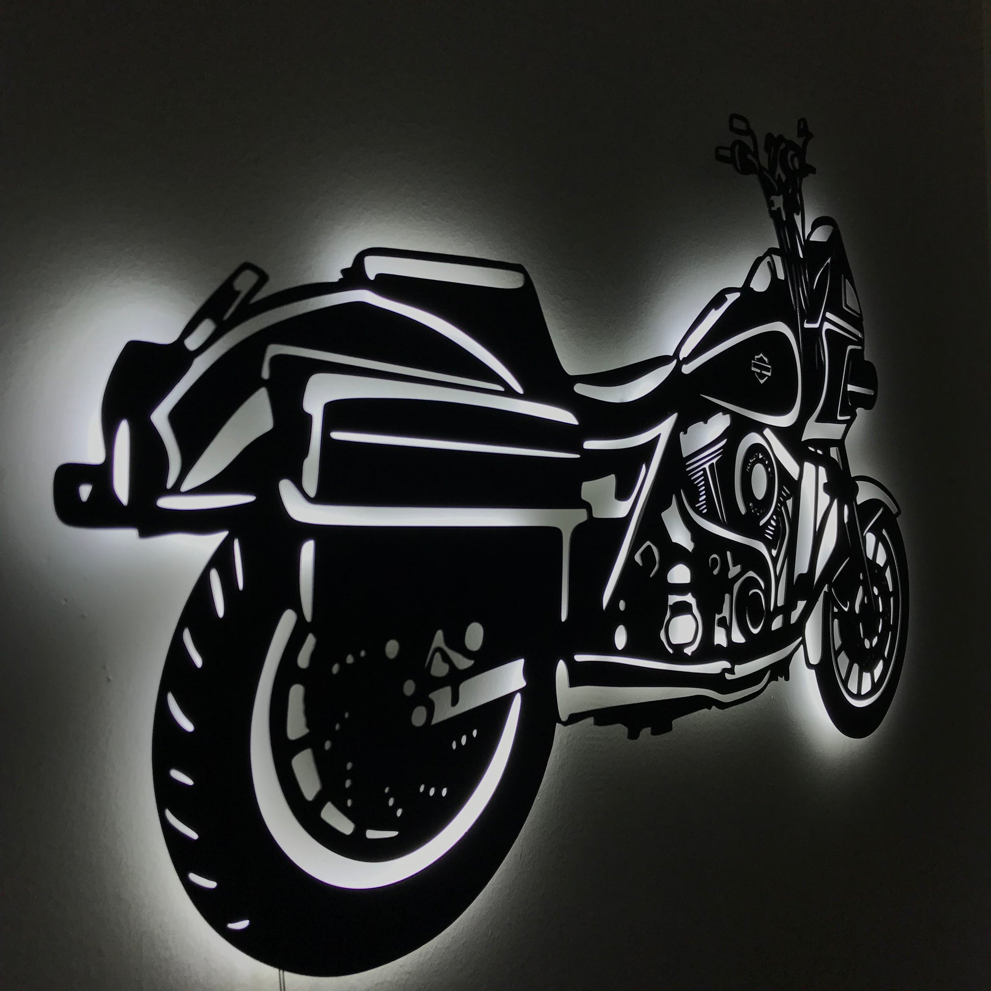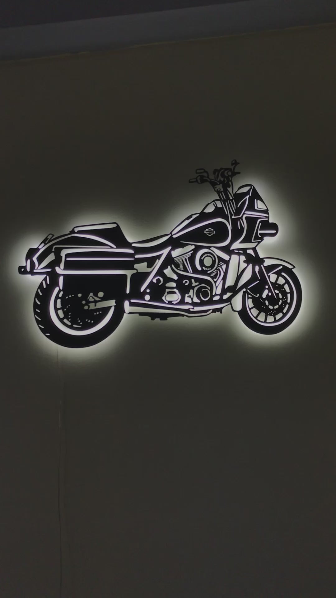 Kick up a rebellious vibe with motorcycle wall art—a laser-cut outlaw motorcycle silhouette in a deep matte black finish with a subtle LED halo. Rugged yet refined, it suits garages, bars, studios, offices, and covered outdoor areas. (Not affiliated with or endorsed by any motorcycle brand or club.)